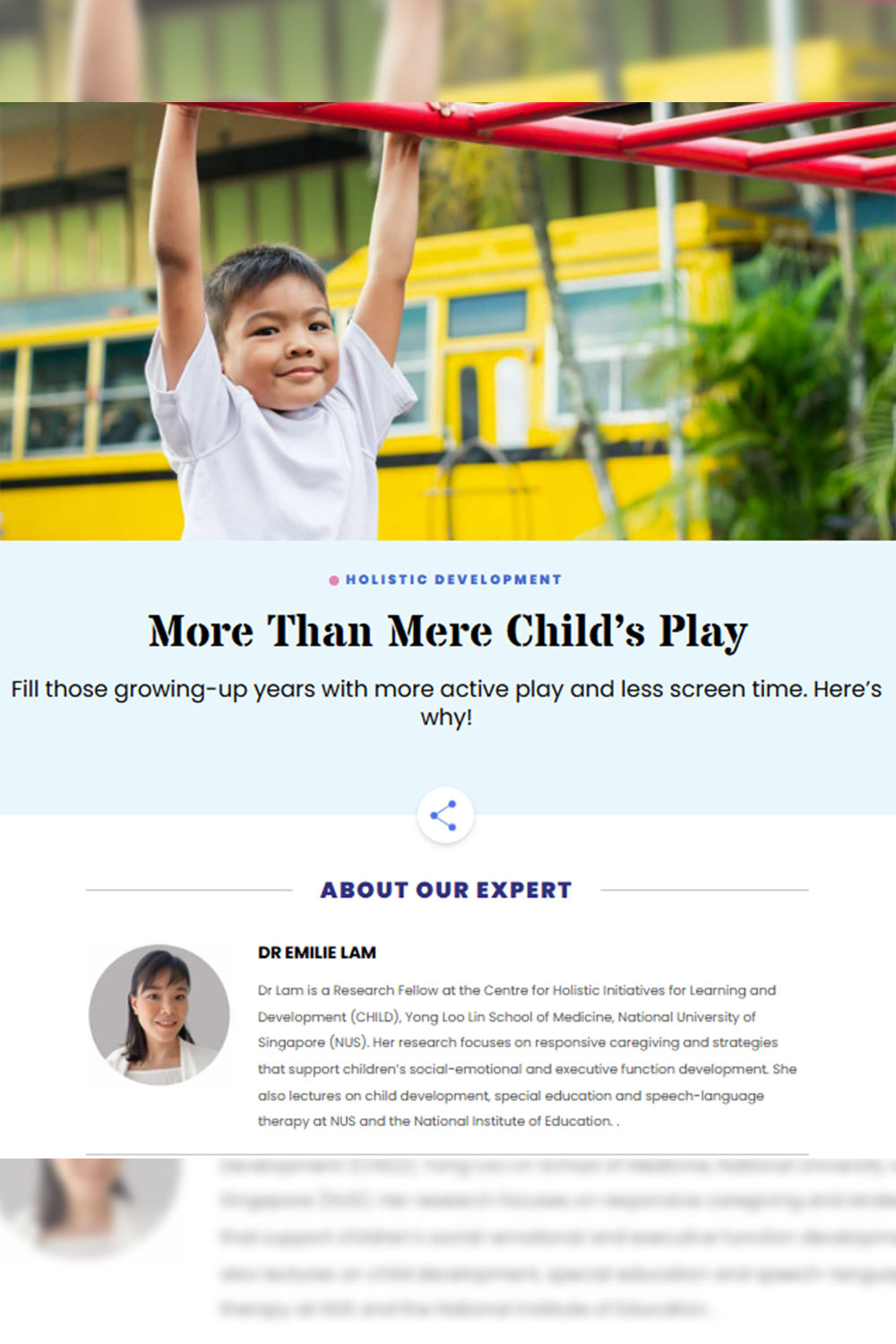 The Centre for Holistic Initiatives for Learning and Development (CHILD) was established under the umbrella of NUS Yong Loo Lin School of Medicine (NUS Medicine) with the Lien Foundation. In collaboration with other partners such as the Centre for Evidence and Implementation (CEI), National University Hospital (NUH) and A*STAR Institute for Human Development and Potential (A*STAR IHDP), CHILD brings together experts in the field of translational research, child development, and implementation science to help give children the best start to life.