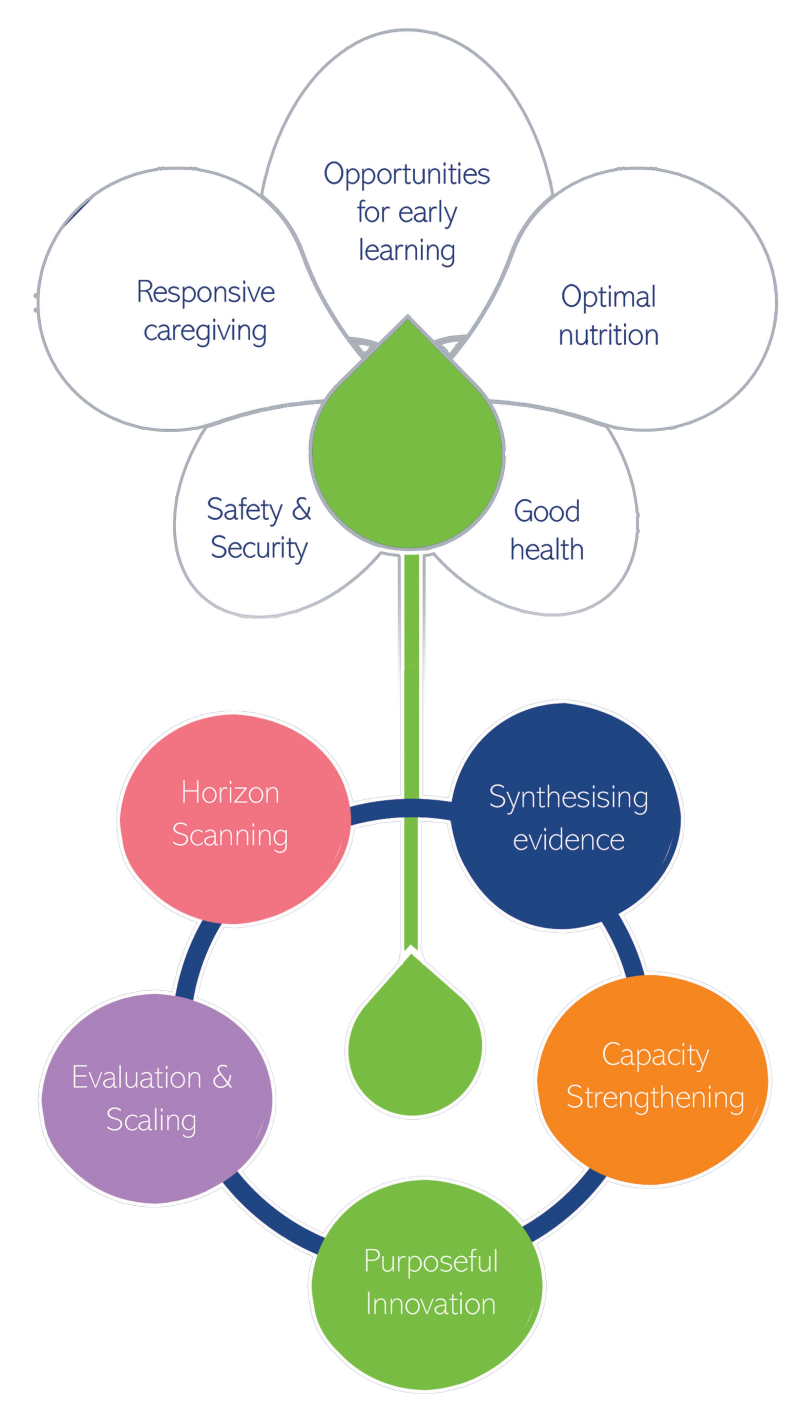Our mission to give all children the best start in life will be achieved through five highly complementary and interdependent tracks of work: Horizon Scanning, Synthesising evidence, Evaluation and Scaling, Capacity Strengthening and Purposeful Innovation. Each track of work will inform and impact the other in a continuous improvement loop.